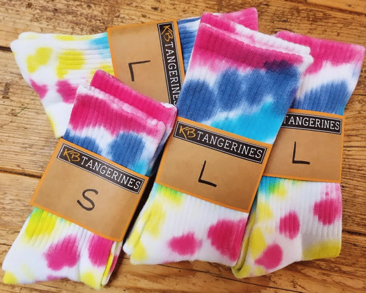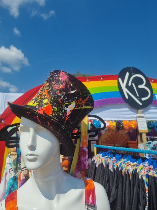 Our founder, Alice, has been making colourful and unique tie-dye dungarees for over 9 years. The idea was born when, for Secret Garden Party, Alice made rainbow dungarees (using painter's overalls) for a group of friends and herself. The response these outfits generated was inspiring, and KB Tangerines was born!