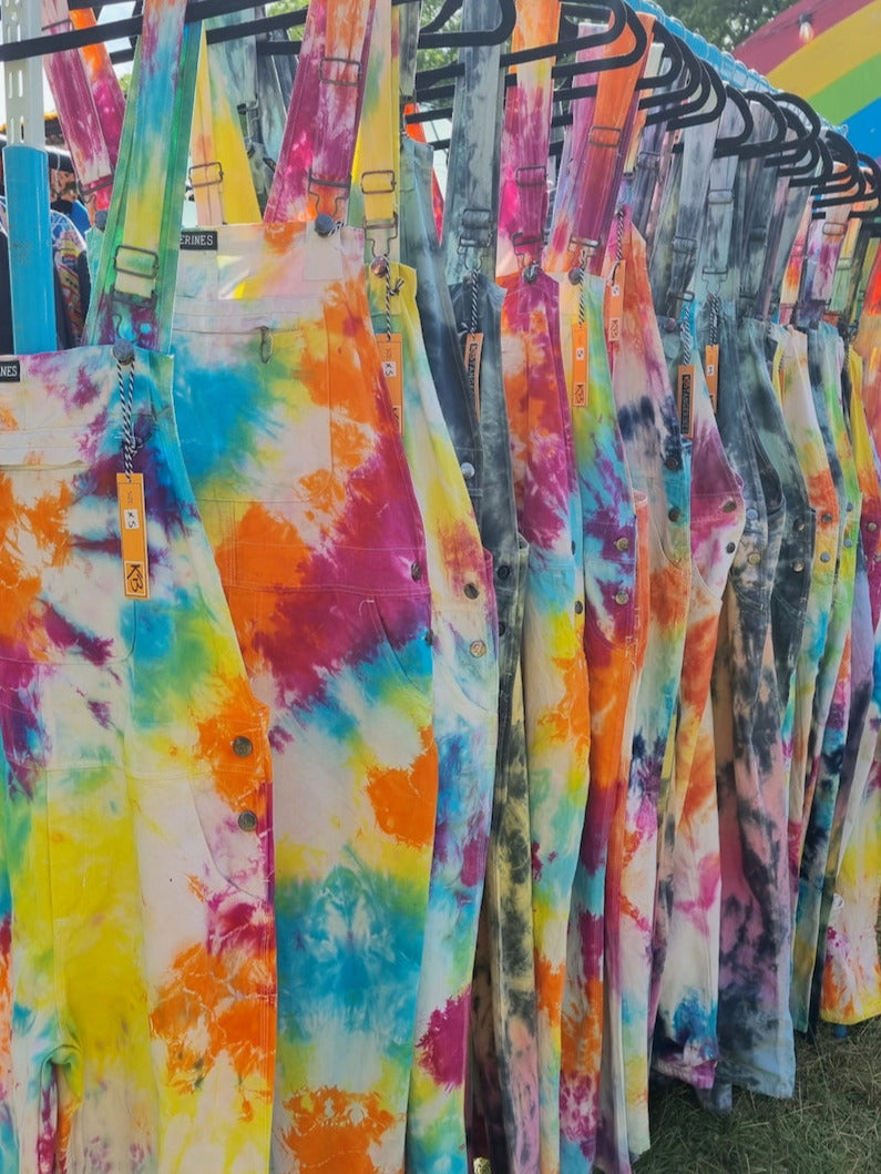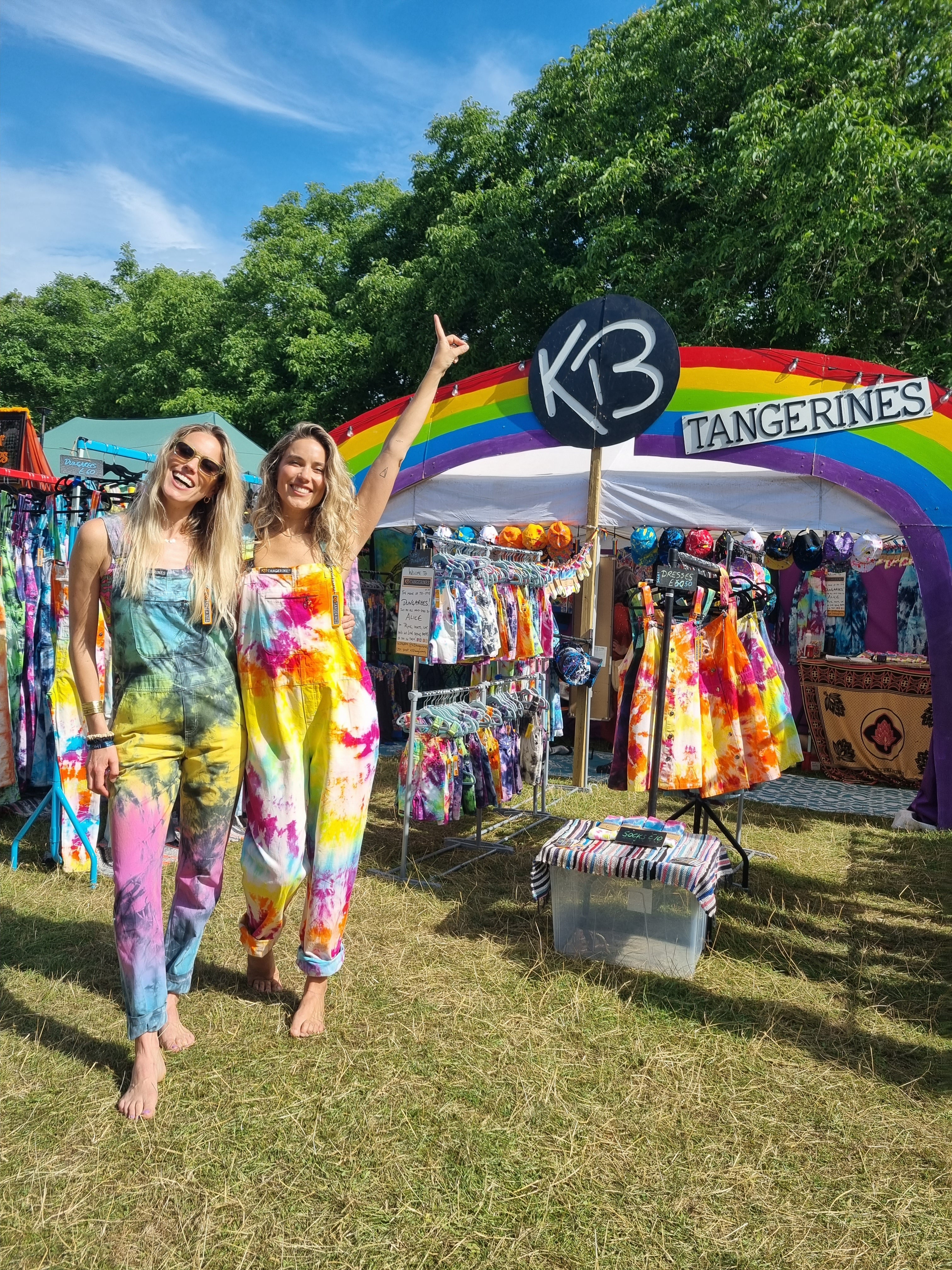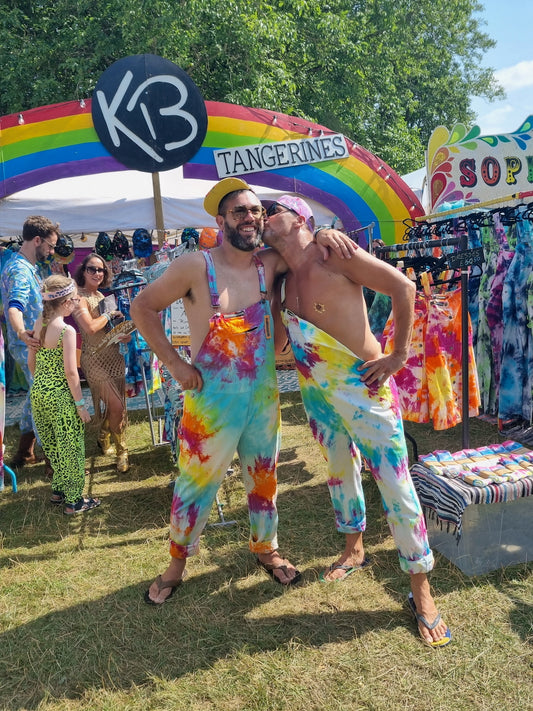 Our founder, Alice, has been making colourful and unique tie-dye dungarees for over 9 years. The idea was born when, for Secret Garden Party, Alice made rainbow dungarees (using painter's overalls) for a group of friends and herself. The response these outfits generated was inspiring, and KB Tangerines was born!