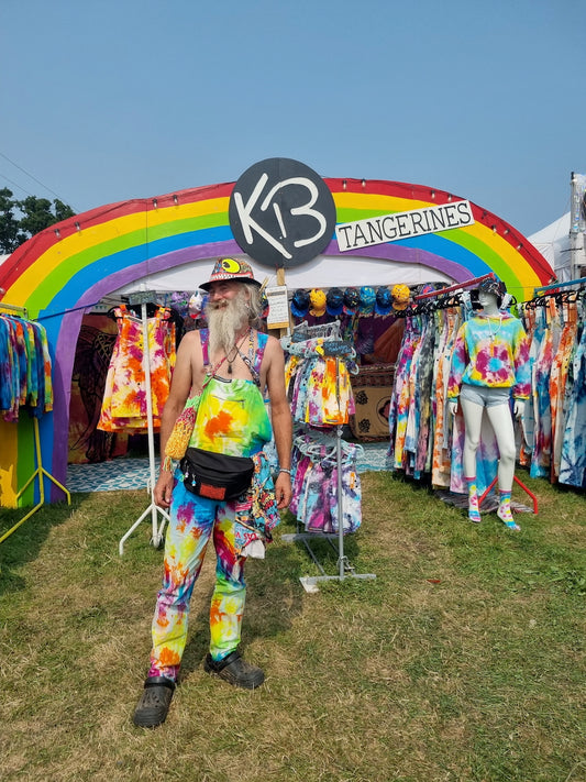 Our founder, Alice, has been making colourful and unique tie-dye dungarees for over 9 years. The idea was born when, for Secret Garden Party, Alice made rainbow dungarees (using painter's overalls) for a group of friends and herself. The response these outfits generated was inspiring, and KB Tangerines was born!